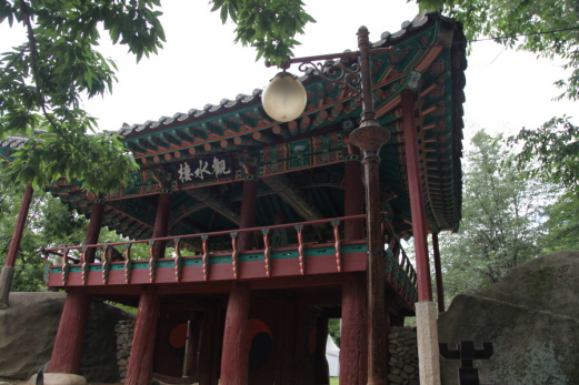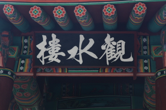 관수루는 요수 신권(樂水 愼券), 석곡 성팽년(石谷 成彭年), 황고 신수이(黃皐 愼守彛) 선생의 정신을 계승하기 위하여 사림이 세운 구연서원의 문루로 1740년(영조 16년)에 건립 하였다. 관수(觀水)란 [맹자(孟子)]에 '물을 보는데(觀水) 방법이 있으니, 반드시 그 물의 흐름을 봐야 한다. 흐르는 물은 웅덩이를 채우지 않고는 다음으로 흐르지 않는다' 고 한 말을 인용한 것으로 군자의 학문은 이와 같아야 한다는 뜻으로 이름 지었다. 누각은 일반적으로 군현의 관아 소재지의 경치가 수려한 곳에 세워서 고을의 현감이나 중앙의 관리들이 일정한 날을 택해 인근 선비들을 불러 시회(詩會)나 연회를 열기도 하고, 평소에는 고을 사람들이 올라 쉬거나 더위를 피하는 장소로 이용하였다. 따라서 누각은 고을을 상징하는 대표적 건물이 되기 때문에 사찰의 대웅전 앞이나 향교와 서원의 입구에 세워 그 건물의 격을 높이는 역할을 한다. 이 누각은 정면 세 칸, 측면 두 칸에 계자난간 팔작지붕이고, 커다란 거북이 형상을 한 자연석 위에 세운 활주와 일부러 휘어지고 굽어 용트림한 형태의 기둥이 자연과의 조화를 추구하는 거창지역 누각의 특징을 잘 반영하고 있다.