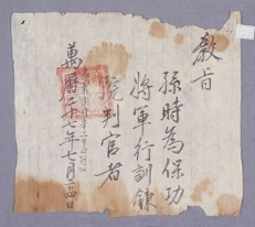 고문서-교령류-고신 정치·행정-임면-고신 32책 경주 양동 경주손씨 종가 송첨편Ⅰ-고문서-교령류-교지 1597년 손시(孫時) 고신(告身) 손시萬曆25년(1597) 9월에 軍功으로 展力副尉守門將에 임명되었다. 당시 손시는 43세였다. 병조 1597 한성 낱장 1장 종 -