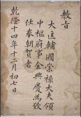 고문서-교령류-고신 정치·행정-임면-고신 86책 서산 대교 경주김씨 충민공 김홍익 후손가편-고문서-학주(김홍욱) 종가-교령류-고신 1749년 김흥경(金興慶) 고신(告身) 국왕:영조 김흥경 1749 한성 낱장 1장 종이 한자 86 고문서 학주(김홍욱) 종가 1. 교령 -