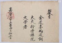 고문서-교령류-홍패 정치·행정-과거-홍패 5책 안동 천전 의성김씨 천상각파편Ⅰ-고문서-교령류-홍패 1819년 김용락(金龍洛) 문과 홍패(文科紅牌) 김용락 예조 1819 이조 낱장 1장 종이 한자 5 고문서 1. 교령류 (1) 교지 홍패 교지 127 59 005_01 -