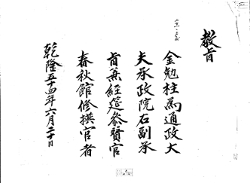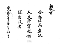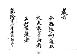 敎旨 10 1789年(正祖 13) 敎旨 【二十一日左副】金勉柱爲通政大 夫承政院右副承 旨兼經筵參贊官 春秋館修撰官者 乾隆五十四年六月二十日 G002+AKS+KSM-XA.1789.1111-20101008.B007a_008_00010_XXX-TXT -