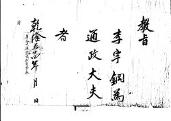 敎旨 李宇鋼爲 通政大夫 者. 建隆五十四年 月 日 年九十依定式, 加資事. 承 傳. G002+AKS+KSM-XA.1789.1111-20101008.B021a_033_00009_XXX-TXT -