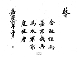 諭書 3 1801年(純祖 1) 諭嘉善大夫平安道觀察 使兼兵馬水軍節度 使巡察使管餉使平 壤府尹金勉柱 卿受委一方體任非輕凡 發兵應機安民制敵 一應常事自有舊章 慮或有予與卿獨斷 處置事非密符莫可 施爲且意外奸謀不 可不預防如有非常之 命合符無疑然後當就 命故賜押第三十三符 卿其受之故諭 嘉慶 -