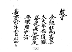敎旨 15 1801年(純祖 1) 敎旨 金勉柱爲嘉善 大夫平安道觀 察使兼巡察使 平壤府尹者 嘉慶六年二月初四日 G002+AKS+KSM-XA.1801.1111-20101008.B007a_008_00015_XXX-TXT -