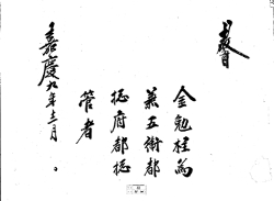 敎旨 14 1801年(純祖 1) 敎旨 金勉柱爲 兼京畿兵 馬水軍節 度使者 嘉慶六年正月 日 G002+AKS+KSM-XA.1801.1111-20101008.B007a_008_00014_XXX-TXT -