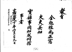 〈1a〉 吏曹嘉慶九年五月 十七日奉 敎學生金鎭華爲 從仕郞者 嘉慶九年五月 日 父延豊縣監金宗壽甲正甲二別代加合二幷授 正郞 判書臣金〔着名〕 參判 參議 佐郞 [吏曹之印] 【別紙】 吏曺司䆃奉事金宗壽 今五月初五日行 敬陵端午祭贊者差 定發致齋者 辛酉五月日 堂上〔着 -