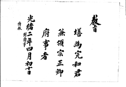 敎旨 21 1876年(高宗 13) 敎旨 墡爲完和君 兼領宗正卿 府事者 光緖二年四月初十日 【 封爵事】 【 傳敎】 G002+AKS+KSM-XA.1876.1111-20101008.B009a_010_00078_XXX-TXT -