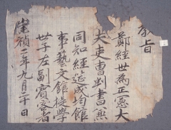 고문서-교령류-유지 국왕·왕실-교령-유지 72책 남원·구례 삭녕최씨편Ⅰ-고문서-교령류-유지 1629년 최연(崔葕) 유지(有旨) 국왕:인조 최연 1629 한성 낱장 1장 종이 한자 72 고문서 1. 교령류 (2) 유지 유지 유지 3 7 072_0004 출판정보:『고문 -