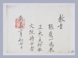 고문서-교령류-고신 정치·행정-임면-고신 79책 구미 옥산 인동장씨 여헌 장현광 종가편-고문서-교령류-고신 1640년 장응일(張應一) 고신(告身) -5 국왕:인조 장응일 1640 한성 낱장 1장 종이 한자 79 고문서 1. 교령류 (3) 고신 고신 고신 46 50 -