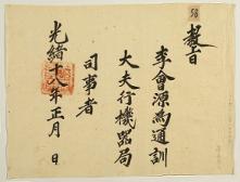 1893년(고종30)에 김해의 처 단인이씨를 법전에 의거하여 정부인으로 추증하는 문서.고문서-교령류-고신 정치·행정-임면-고신 1책 안동 오천 광산김씨 후조당편-고문서-교령류-고신 1893년 단인이씨(端人李氏) 고신(告身) -1 국왕:고종 이씨1893년, 정부인으로 추증되었다. 1893 한양 낱장 1장 종이 한자 施命之寶 1 고문서 교령류 교령류 고