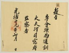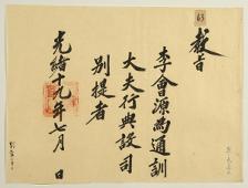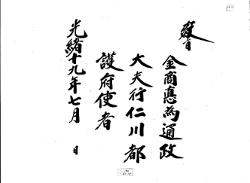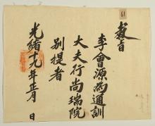 1893년(고종30)에 김해의 처 단인이씨를 법전에 의거하여 정부인으로 추증하는 문서.고문서-교령류-고신 정치·행정-임면-고신 1책 안동 오천 광산김씨 후조당편-고문서-교령류-고신 1893년 단인이씨(端人李氏) 고신(告身) -2 국왕:고종 이씨1893년, 정부인으로 추증되었다다. 1893 한양 낱장 1장 종이 한자 施命之寶 1 고문서 교령류 교령류 -