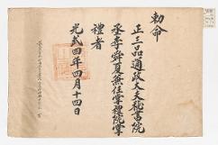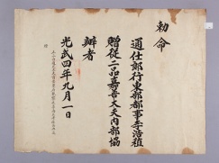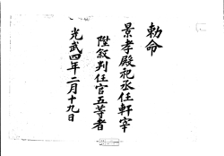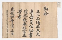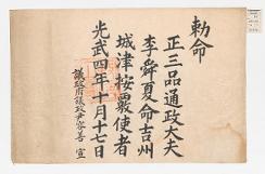 고문서-교령류-관고 정치·행정-임면-관고 110책 제주 어도 진주강씨·조천 김해김씨·구좌 동래정씨 고문서-고문서-진주강씨-강수황 후손가-교령류-관고 관고(官誥) 이건하 1901 제주특별자치도 제주시 애월읍 봉성리 110 고문서 진주강씨 교령류 관고 관고 26 제주 -