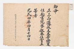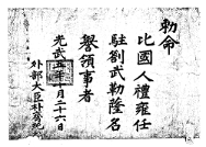고문서-교령류-관고 정치·행정-임면-관고 10책 장서각편Ⅰ-고문서-교령류-칙명 1901년 외부대신(外部大臣) 박제순(朴齊純) 칙명(勅命) 국왕:고종 박제순 1901 한성 낱장 1장 종이 한자 10 고문서 1. 교령류 (13) 칙명 칙명 칙명 2 130 010_008 -
