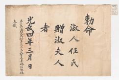 고문서-교령류-관고 정치·행정-임면-관고 1900년 이순하 처 풍천임씨(李舜夏 妻 豊川任氏) 추증관고(追贈官誥) 이순하 처 풍천임씨 1900 1 勅命之寶(11.0×11.0) 김포 전주이씨 효헌 이인철 후손가 한국학중앙연구원 장서각 G002+AKS+KSM- -