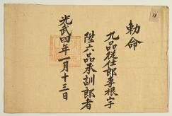 고문서-교령류-관고 정치·행정-임면-관고 71책 이천 부발 풍천임씨·양주 광주정씨편-고문서-풍천임씨-교령류-관고 1900년 최씨(崔氏) 관고(官誥) 국왕:고종 최씨 1900 한성 낱장 1장 종이 한자 71 고문서 1. 교령류 (5) 고신 고신 97 106 071_0 -