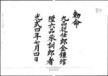 고문서-교령류-고신 정치·행정-임면-고신 104책 영광 연안김씨 고문서Ⅰ-고문서-교령류-고신 고신(告身) -63 황제(고종) 1900 외간리 104 고문서 교령류 고신 63 고신 65 영광 연안김씨 김인택 종가 영광 연안김씨 김인택 종가 從仕郞→承訓郞 G -