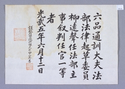 고문서-교령류-차첩 정치·행정-임면-차첩 58책 안산 부곡 진주류씨 경성당편-고문서-교령류-차첩 1901년 유원성(柳遠聲) 차첩(差帖) -6 유원성 장례원 1901 장례원 낱장 1장 종이 한자 58 고문서 1. 교령류 (3) 차정첩 차첩 차정첩 9 18 058_00 -