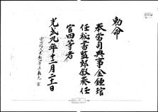 고문서-교령류-고신 정치·행정-임면-고신 104책 영광 연안김씨 고문서Ⅰ-고문서-교령류-고신 고신(告身) -67 황제(고종) 1905 외간리 104 고문서 교령류 고신 67 고신 69 영광 연안김씨 김인택 종가 영광 연안김씨 김인택 종가 奉常司典事→秘書監 -