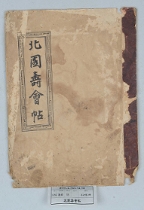 1569년(宣祖 2) 3월 9일 朴湖叟의 壽宴을 기념하여 그 자리에 모인 명단과 序文, 작성한 七言絶句 등을 편집하여 1913년에 간행한 것.고서-집부-총집류 교육·문화-문학저술-시 경주 경주이씨 이찬우 소장 전적-고서-집부-총집류 북원수회첩(北園壽會帖) 1913 석인본 양장 不分卷1冊(11張) 揷圖 사주쌍변 유계 10行字數不定 무어미 고서 집부 집부 53 D03_1256 한국 고문서 조사정리 및 보존처 -
