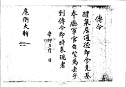 1711년(숙종37) 호위대장이 예천에 사는 김극기(金克基)를 본청 군관에 자망하니 즉시 오라는 내용의 전령 전령(傳令) 예천(醴泉)에 사는 통덕랑 김극기(金克基)를 본청(本廳) 군관(軍官)으로 자망(自望)하니, 전령이 도착하는 대로 즉시 와서 나타나도록 할 것. -