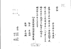 賞証 第四學年朴萬熙 右學員이 第四學年第二學期試驗에 成 績이 良好ᄒᆞ야 㝡優等第一人에 居ᄒᆞ얏기로 略干賞品을 施與ᄒᆞ고 証書를 給付홈 明治四十四年十二月二十四日 [私立]忠南扶餘郡公洞面信明義塾 塾長 李兢稙 敎師 李相麟 [印章] 賞品 洋紙 五丈 毛筆 三柄 鉛筆 一柄 G00 -