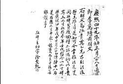 康熙五十三年甲午三月十一日尹生員宅奴 奉石處明文 右明文事段矣亦奉老母是白如可値此大無之年許多家率▣(生) 活爲難乙仍于勢不得已自己買得耕食爲在縣地白蓮洞里中暑字 垈田今種拾斗落只負數兩庫幷貳拾柒卜庫乙價折錢文拾 兩五戔以交易依數捧上爲遣同右處兩庫本文記及牌字一丈幷 以永永放賣爲去乎日後同生族姪 -