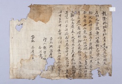 土地文記 5 乾隆十九年甲戌十二月二十六日 孫德三處明文 右明文爲臥事段 矣上典利買次 吉安悟道員尹字八十畓二卜四束 佐字六畓四卜七束等㐣 參拾兩乙 依數捧上爲遣 右人處 牌旨導良本文記 并永永放賣爲去乎 日後子孫中 雜談有去等 持此文告官卞正事 畓主 私奴 貴卜〔左寸〕 證人 寺奴 日貴〔左寸 -