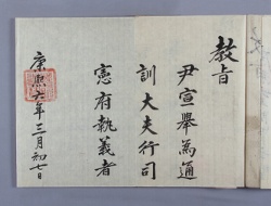 1667년(현종8) 승정원에서 사헌부집의에 임명된 윤선거에게 빨리 올라오라는 왕명을 전달하는 유지 동부승지 심(沈)〔착명〕 지금 너를 사헌부집의(司憲府執義)에 임명하니 너는 빨리 역말을 타고 올라오라는 내용으로 유지를 내린다. 강희 6년 3월 초8일 [승정원인(承政 -