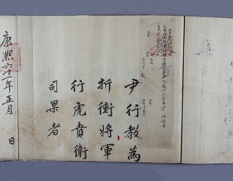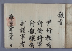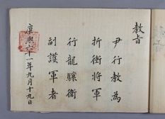 1722년(경종2) 9월에 윤행교(尹行敎)를 용양위부호군(副護軍)으로 임명한 4품이상 고신(告身). 교지 윤행교(尹行敎)를 절충장군(折衝將軍, 서반 정3품 상) 행(行) 용양위(龍驤衛) 부호군(副護軍, 종4품)으로 삼아라. 강희 61년(1722, 경종 2) 9월 일 -