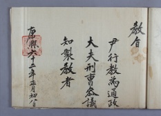 1723년(경종3) 1월 8일에 윤행교(尹行敎)를 형조참의, 지제교로 임명한 4품이상 고신(告身). 교지 윤행교(尹行敎)를 통정대부(通政大夫, 정3품 상) 형조참의(刑曹參議, 정3품) 지제교(知製敎)로 삼아라. 강희 62년(1723, 경종 3) 1월 8일 ([시명지 -