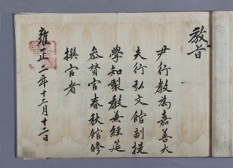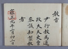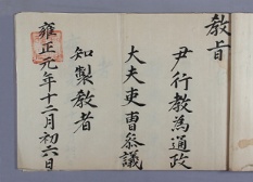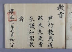 1723년(경종3) 12월 6일에 윤행교(尹行敎)를 교지 윤행교(尹行敎)를 통정대부(通政大夫, 정3품 상) 이조(吏曹) 참의(參議, 정3품) 지제교(知製敎)로 삼아라. 옹정 원년(1723, 경종 3) 12월 6일 ([시명지보(施命之寶)], 方10㎝ 1개) G002+ -