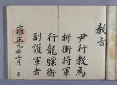 1723년(경종3) 11월에 윤행교(尹行敎)를 용양위부호군으로 임명한 4품이상 고신(告身). 교지 윤행교(尹行敎)를 절충장군(折衝將軍, 서반 정3품 상) 행(行) 용양위(龍驤衛) 부호군(副護軍, 종4품)으로 삼아라. 옹정 원년(1723, 경종 3) 11월 일 ([시 -