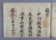 1723년(경종3) 4월 9일에 윤행교(尹行敎)를 장례원판결사(判決事), 지제교(知製敎)로 임명한 4품이상 고신(告身). 교지 윤행교(尹行敎)를 통정대부(通政大夫, 정3품 상) 장례원(掌隸院) 판결사(判決事, 정3품) 지제교(知製敎)로 삼아라. 옹정 원년(1723, -