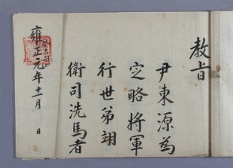 1723년(경종3) 11월에 윤동원(尹東源)을 별가하여 자급을 올리고 세제익위사 세마(洗馬)로 임명한 4품이상 고신(告身). 교지 윤동원(尹東源)을 정략장군(定略將軍, 서반 종4품 상) 행(行) 세제익위사(世弟翊衛司) 세마(洗馬)로 삼아라. 옹정 원년(1723, 경 -