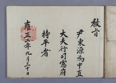 1724년(경종4) 9월 30일에 윤동원(尹東源)을 사헌부지평(持平)으로 임명한 4품이상 고신(告身). 교지 윤동원(尹東源)을 중직대부(中直大夫, 종3품 상) 행(行) 사헌부(司憲府) 지평(持平, 정5품)으로 삼아라. 옹정 2년(1724, 경종 4) 9월 30일 ( -