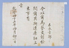 1777년 김면주를 예문관 검열에 임명하며 내린 유지(有旨) 우승지 정(鄭) (수결) 지금 너를 예문관 검열에 임명하노니, 너는 빨리 역마를 타고 올라올 일로 내린 유지(有旨). 건륭(乾隆) 42년(1777) 4월 1일. 예문관 검열 김면주가 개봉하라.(수결) G0 -