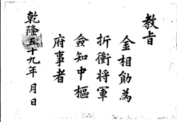 1794년(정조18) 김상훈을 절충장군 첨지중추부사로 임명하는 교지 교지 김상훈(金相勛)을 절충장군(折衝將軍) 첨지중추부사(僉知中樞府事)로 삼음. 건륭 59년 월 일 [시명지보] G002+AKS+KSM-XA.1794.1111-20101008.B005l_005_000 -
