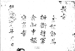 1773년(영조49) 김우하를 절충장군 첨지중추부사로 임명하는 교지 교지 김우하(金禹河)를 절충장군(折衝將軍) 첨지중추부사(僉知中樞府事)로 삼음. 건륭 38년 3월 일 [시명지보] G002+AKS+KSM-XA.1773.1111-20101008.B005m_005_00 -