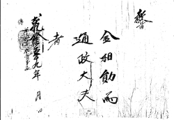 1794년(정조18) 김상훈을 통정대부로 임명하는 교지 교지 김상훈(金相勛)을 통정대부(通政大夫)로 삼음. 건륭 59년 월 일 나이 [81세로] 가자(加資)하라는 일로 승전(承傳)함. [시명지보] G002+AKS+KSM-XA.1794.1111-20101008.B00 -