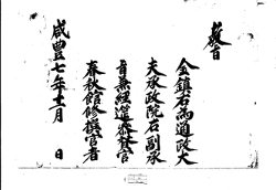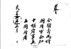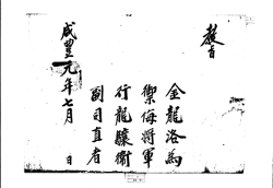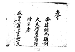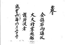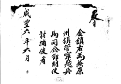 1856년(철종7) 철종이 김진우를 겸 원주진관 영월병마동첨절제사 토포사에 임명한 고신 교지 김진우(金鎭右)를 겸(兼) 원주진관(原州鎭管) 영월병마동첨절제사(寧越兵馬同僉節制使) 토포사(討捕使)로 삼아라. 함풍 6년 6월 일 [시명지보(施命之寶)] G002+AKS+K -