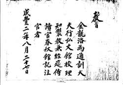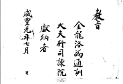 1856년(철종7) 철종이 김용락을 통훈대부 종부시 정 겸 춘추관편수관에 임명하는 고신 교지 김용락(金龍洛)을 통훈대부(通訓大夫) 종부시 정(宗簿寺正) 겸 (兼) 춘추관편수관(春秋館編修官)으로 삼아라. 함풍 6년 8월 16일 [시명지보(施命之寶)] G002+AKS+ -