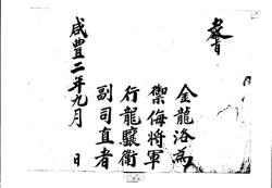 1854년(철종5) 철종이 김용락을 선략장군 행용양위부사과에 임명하는 고신 교지 김용락(金龍洛)을 선략장군(宣略將軍) 행(行) 용양위부사과(龍驤衛副司果)로 삼아라. 함풍 4년 12월 일 [시명지보(施命之寶)] G002+AKS+KSM-XA.1854.1111-20101 -