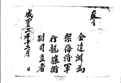 1852년(철종3) 철종이 김달연을 어모장군 행용양위부사직에 임명하는 고신 교지 김달연(金達淵)을 어모장군(禦侮將軍) 행(行) 용양위부사직(龍驤衛副司直)으로 삼아라. 함풍 2년 12월 일 [시명지보(施命之寶)] G002+AKS+KSM-XA.1852.1111-2010 -