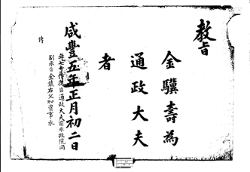 1855년(철종6) 철종이 김기수를 통정대부에 임명하는 고신 교지 김기수(金驥壽)를 통정대부(通政大夫)로 삼아라. 함풍 5년 정월 초2일 나이 70세인 시종신(侍從臣) 통정대부(通政大夫) 전(前) 승정원동부승지(承政院同副承旨) 김진우(金鎭右)의 아버지[父]를 가자( -