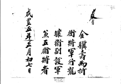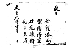 1855년(철종6) 철종이 김기수를 절충장군 행용양위부호군 겸 오위장에 임명하는 고신 교지 김기수(金驥壽)를 절충장군(折衝將軍) 행(行) 용양위부호군(龍驤衛副護軍) 겸 (兼) 오위장(五衛將)으로 삼아라. 함풍 5년 정월 초7일 [시명지보(施命之寶)] G002+AKS -