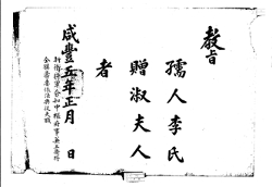 1855년(철종6) 철종이 이씨를 숙부인에 추증하는 추증교지 교지 유인(孺人) 이씨(李氏)를 숙부인(淑夫人)으로 증직하라. 함풍 5년 정월 일 절충장군(折衝將軍) 첨지중추부사(僉知中樞府事) 겸 (兼) 오위장(五衛將)인 김기수(金驥壽)의 처를 법전(法典)에 따라 남편 -