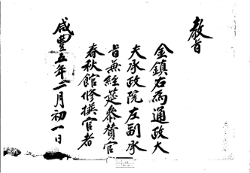 1855년(철종6) 철종이 김진우를 통정대부 승정원우부승지 겸 경연참찬관 춘추관수찬관에 임명하는 고신 교지 김진우(金鎭右)를 통정대부(通政大夫) 승정원우부승지(承政院右副承旨) 겸 (兼) 경연참찬관(經筵參贊官) 춘추관수찬관(春秋館修撰官)으로 삼아라. 함풍 5년 정월 -
