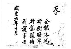 1857년(철종8) 철종이 김진우를 절충장군 행용양위부호군에 임명하는 고신 교지 김진우(金鎭右)를 절충장군(折衝將軍) 행(行) 용양위부호군(龍驤衛副護軍)으로 삼아라. 함풍 7년 11월 일 [시명지보(施命之寶)] G002+AKS+KSM-XA.1857.1111-2010 -