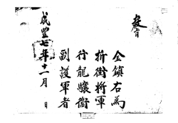 1858년(철종9) 철종이 김진우를 절충장군 행용양위부호군에 임명하는 고신 교지 김진우(金鎭右)를 절충장군(折衝將軍) 행(行) 용양위부호군(龍驤衛副護軍)으로 삼아라. 함풍 8년 10월 일 [시명지보(施命之寶)] G002+AKS+KSM-XA.1858.1111-2010 -