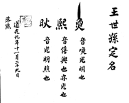 諱․字望 12 1829年(純祖 29) 王世孫定字 ‧ 奐【音喚光明也】 熙 【音僖興也亦光也】 炚 【音光明照也】 ▣(啓) 道光九年十一月二十九日 落點 G002+AKS+KSM-XB.1829.1111-20101008.B009a_010_00356_XXX-TXT -